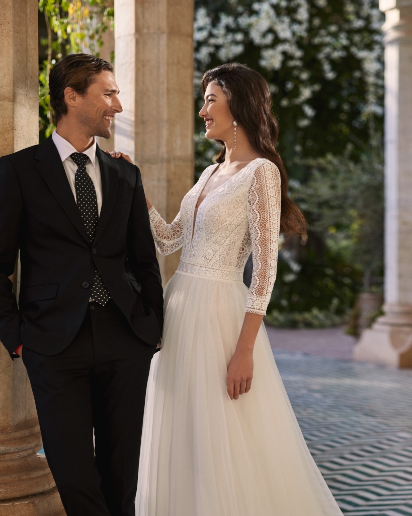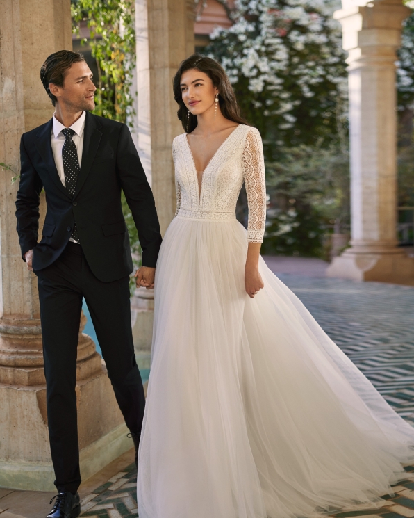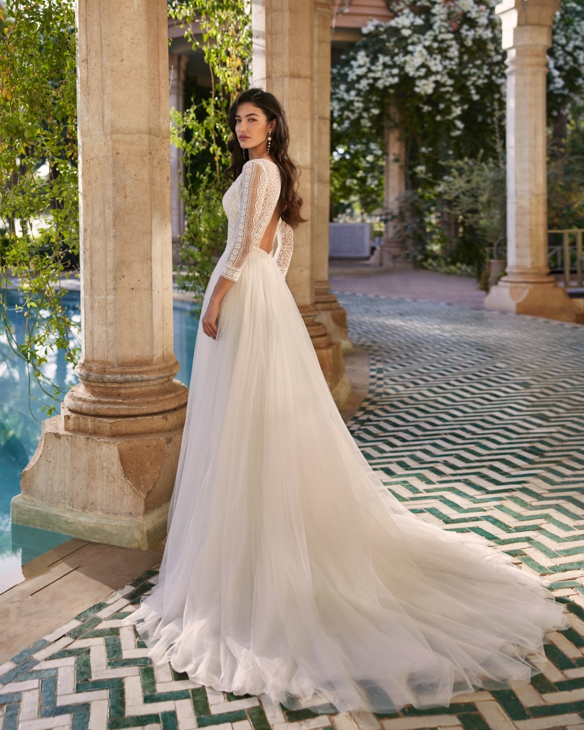 Elegante abito in pizzo e tulle con maniche in trasparenza, profondo scollo a V e schiena scoperta.