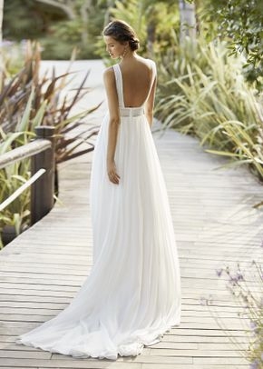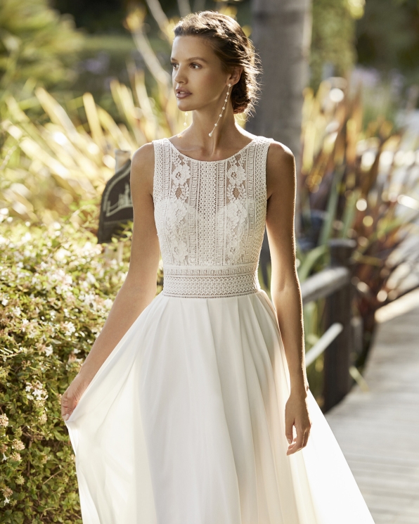 Delizioso abito con corpetto accollato e profonda scolatura squadrata sulla schiena, in pizzo stile vintage molto di tendenza, la cintura alta valorizza il punto vita, da cui parte una gonna ampia in chiffon che accarezza, fluttuante, la figura della sposa, rendendo tutto molto leggero e raffinato. Perfetto per un matrimonio in stile bohémien.