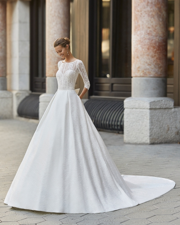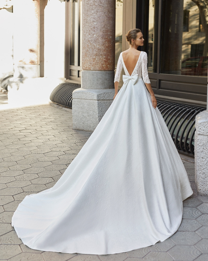 Corpetto in prezioso pizzo stile vintage, lo scollo a barca, la manica e la profonda scollatura sulla schiena, che termina con un fiocco, danno un tocco di raffinata eleganza a questo abito. Un'ampia gonna liscia, rende questo modello ancora più sofisticato ed elegante.