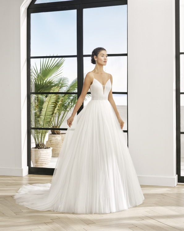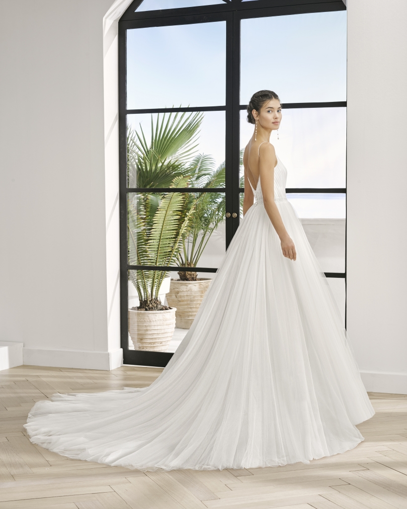 "Poesia" il nome di questo abito rappresenta il modello elegante e raffinato - gonna in tulle morbidamente arricciato in vita, molto ampia, con imponente strascico - corpetto con profonde scollature trattenute da spalline gioiello.