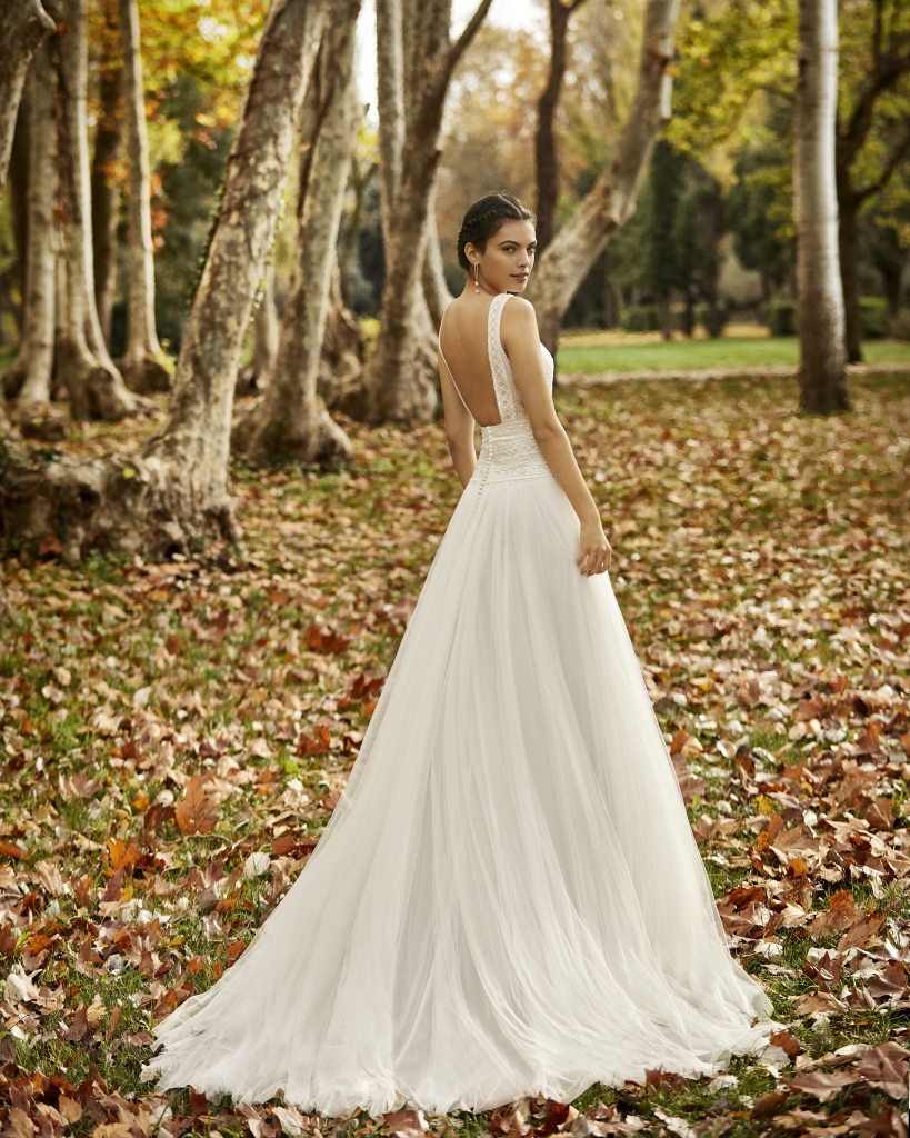 Modello romantico e particolare - corpetto in pizzo stile vintage, che scende con gioco verticale fino alla vita, sottolineando la stessa con motivo orizzontale, terminando sul fianco - originale scollo a barchetta davanti, con profonda scollatura sulla schiena - la gonna in tull seta morbido, ha una leggera arricciatura, termina molto ampia e con lungo strascico.
