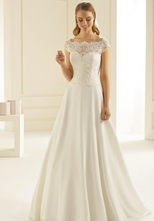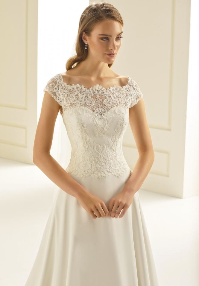 Abito con corpetto in romantico pizzo - delizioso accenno di manica - la scollatura avvolge le spalle con splendido bordo in pizzo - la gonna in tessuto di raso accarezza il fianco e termina con leggero strascico.