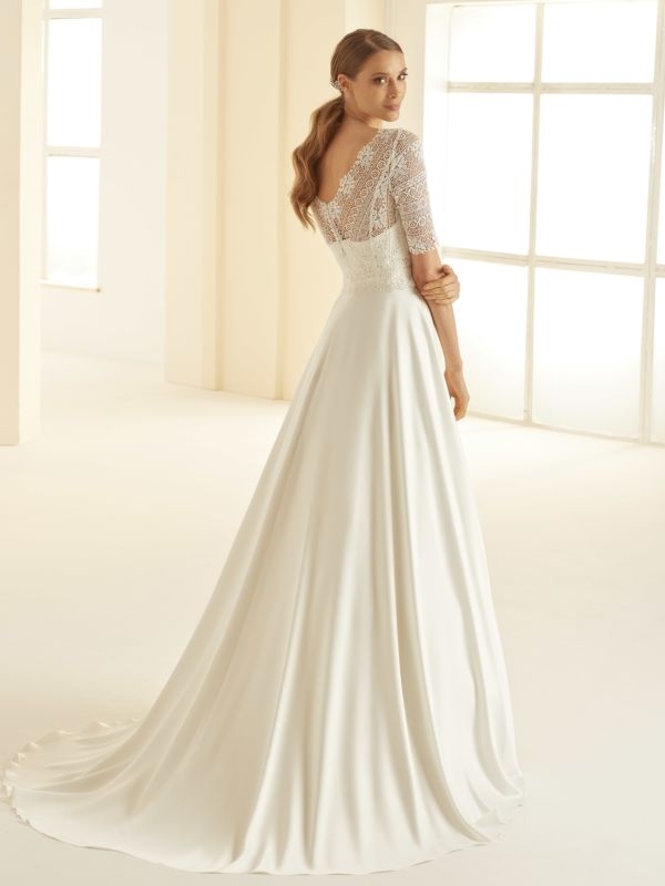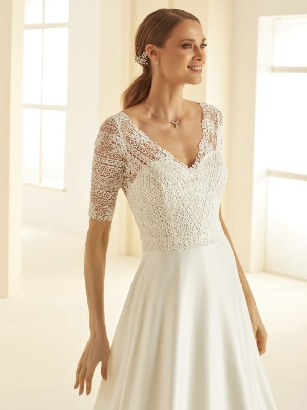 Abito con corpetto in romantico pizzo in stile Vintage Shabby Chic, deliziosa manica al gomito, la scollatura a V davanti e dietro valorizza le spalle ed il decoltè - la gonna in tessuto georgette accarezza il fianco e termina con leggero strascico.