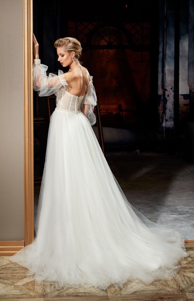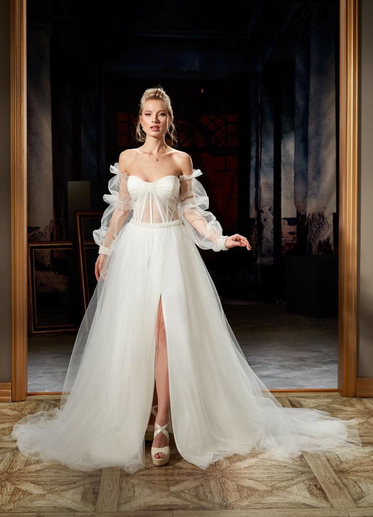 Abito in tulle con spacco, maniche particolari a sbuffo con polsini, cinturino in vita