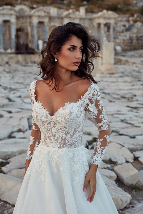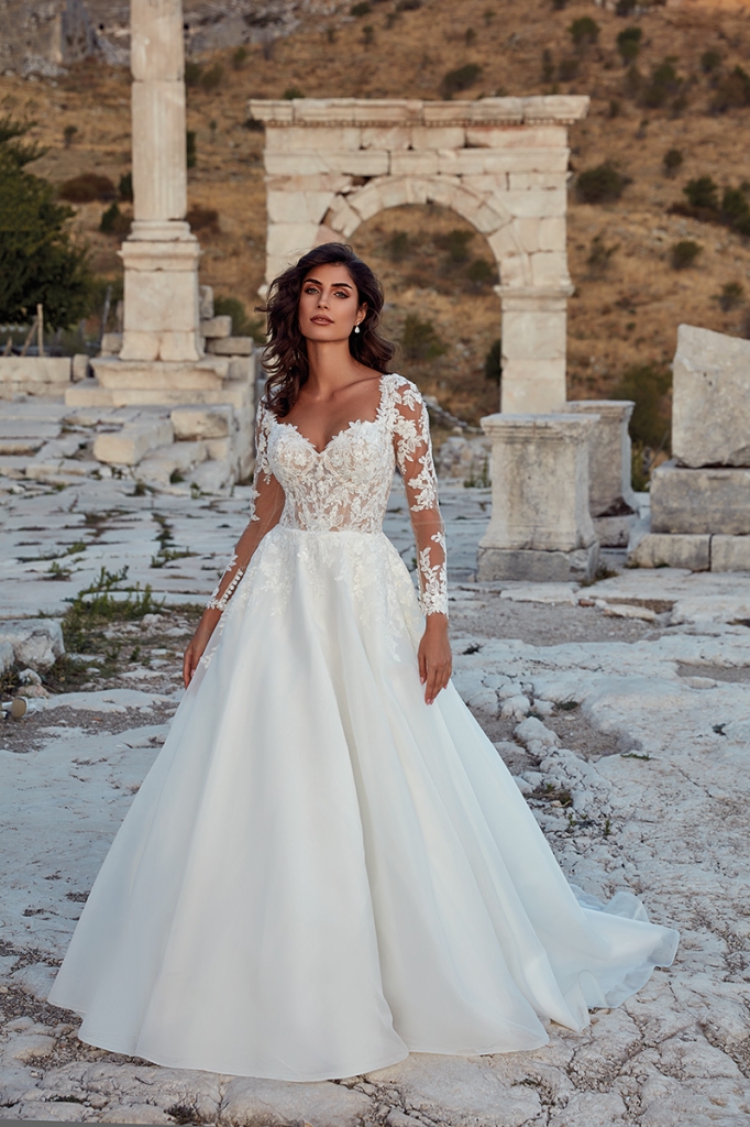 Meraviglioso abito in mikado con corpetto in pizzo luminoso, manica lunga e scollatura profonda.