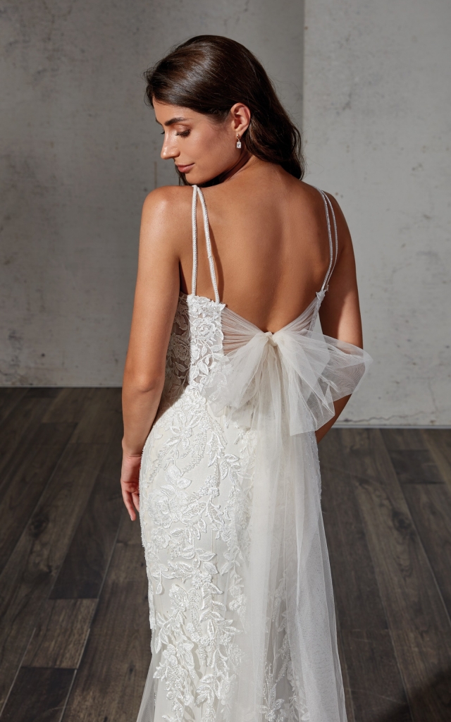 tulle ricamato con dettagli in perline e pailettes, fiocco di tulle e doppia spallina sul retro