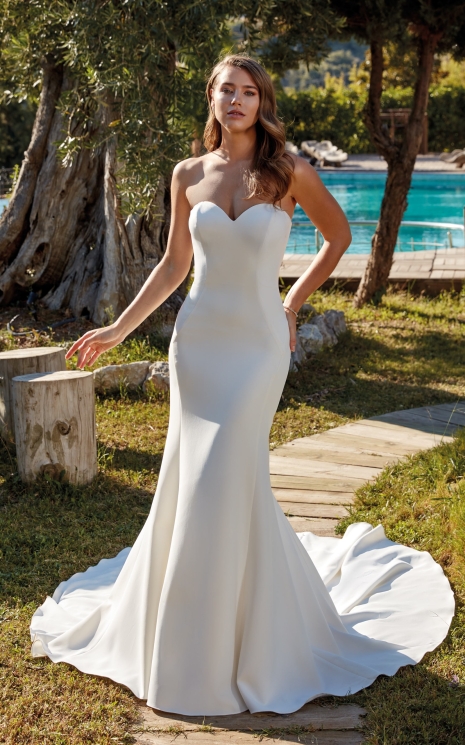 Abito a sirena in crepe con scollo a cuore, bottoncini sul retro fino al fondo, abbinabile a giacchetta in tulle ricamato o a maniche lunghe in chiffon con elastico e polsini.