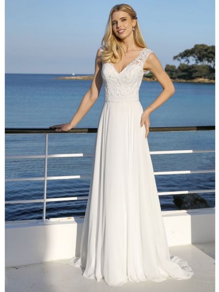 Abito scivolato con scollatura omerale. Corpetto in pizzo valorizzato da luminosi punti luce, la schiena è impreziosita dal pizzo trasparente, con una deliziosa fila di bottoncini, come chiusura.