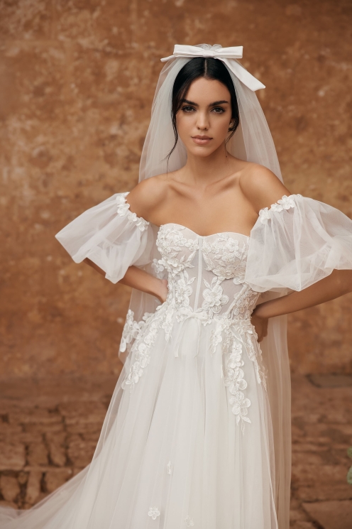 Il dettaglio delle applicazioni di motivi floreali con perline effetto tridimensionale creano in questo abito in tulle un gioco di luce e movimento così come le particolari maniche anch'esse arricchite dagli stessi ricami nella parte alta, il tutto completato da un delicato fiocchetto sul punto vita rendendo questo modello armonioso e estremamente femminile.