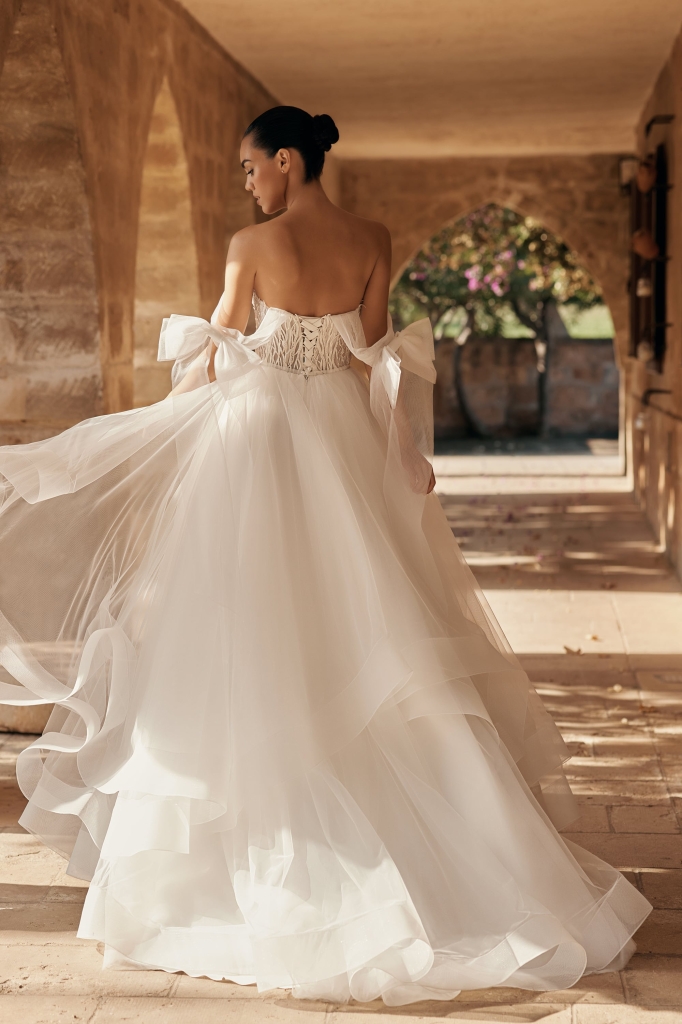 Il corpino di questo abito presenta delle trasparenze e dei particolari motivi ricamati con punti luce, dallo stesso partono due leggerissimi nastri di tulle uniti tra loro per mezzo di fiocchi che cadono delicatamente sulle braccia donando al questo look delicatezza e leggerezza, mentre la gonna a balze con fiocchetto in vita da movimento.