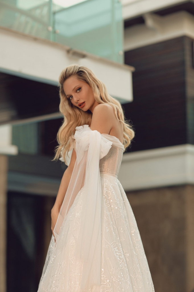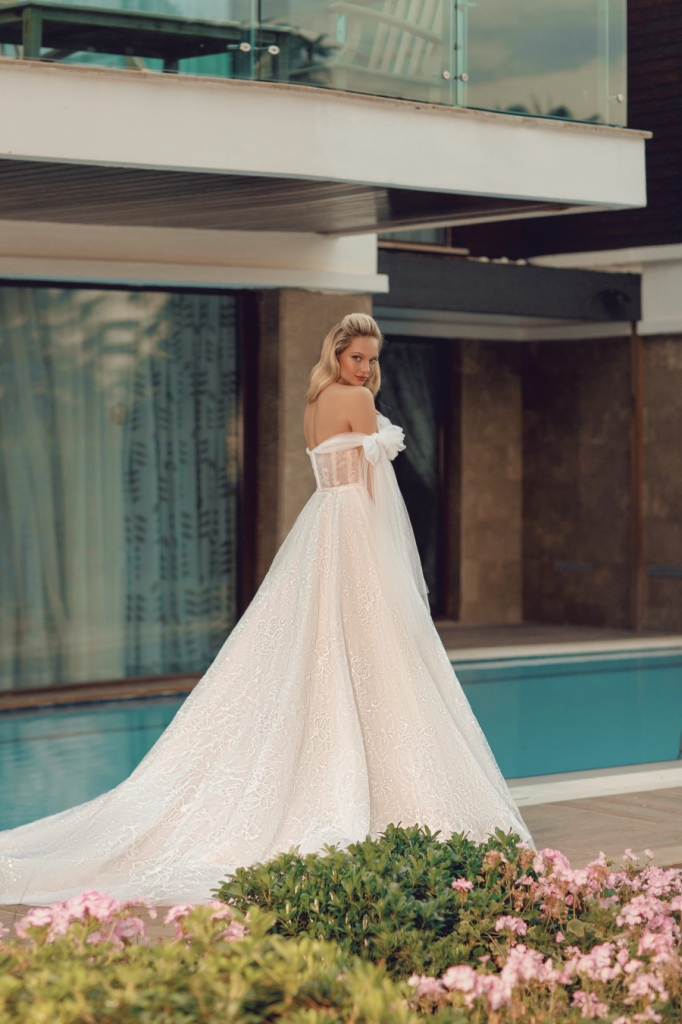 Modello Camilla, meraviglioso abito in pizzo scintillante! Il corpetto è steccato, con un motivo di leggere pieghette di tessuto che accompagnano le maniche appoggiate sul braccio e impreziosite da due fiocchi vaporosi. Deliziosa la sottile cintura che valorizza la gonna, con effetto sopra gonna, sull'abito a tubino. Completa uno strascico importante.