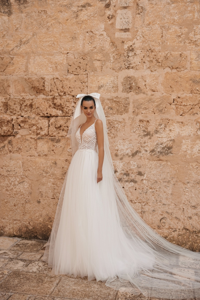 Elegante abito in tulle, corpino con profondo scollo a v sia davanti che dietro, spalline e ricami ricchi di punti luce che formano delicati motivi geometrici.