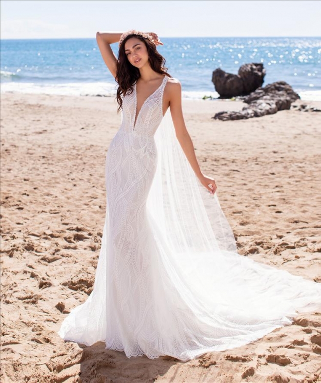Meravigliosa sirena in prezioso e particolare pizzo, stile boèmian - profonda scollatura a V davanti e dietro - lungo ed elegante strascico.