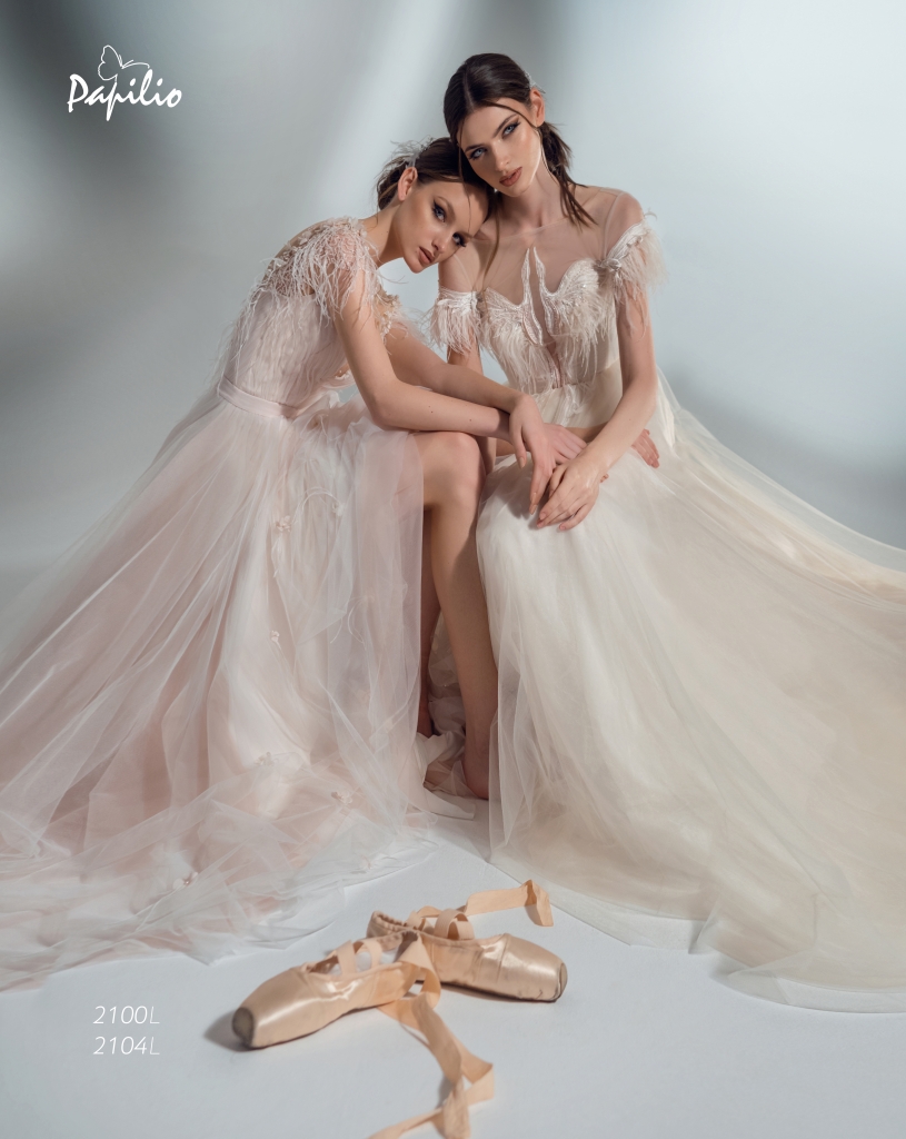 Romantico modello colore rosa cipria, con deliziosi fiori e piumette che decorano il corpetto e le spalle, applicazioni in rilievo valorizzano la gonna ampia con lungo strascico.