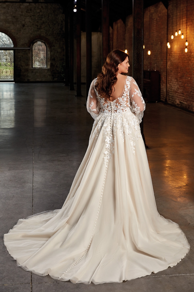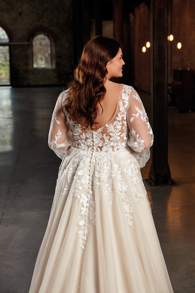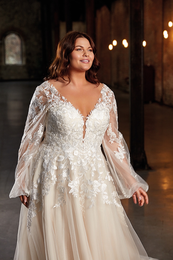 Abito Curvy con corpetto in pizzo e manica leggermente a sbuffo, stile vintage, gonna ampia, pizzo in degradé che scende sulla gonna.