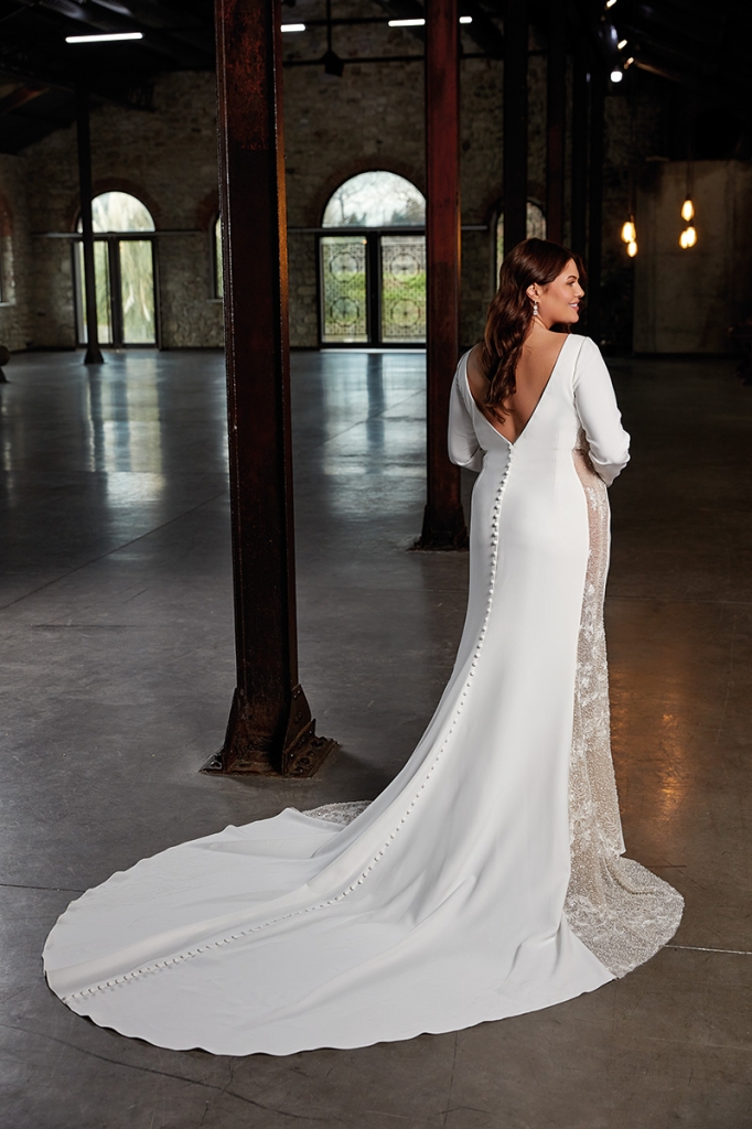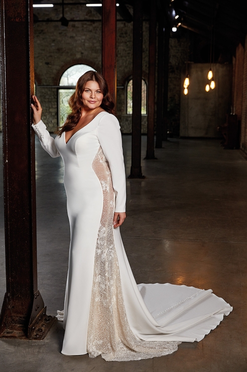 Modello Curvy mezza sirena, in morbido cady con delicate trasparenze laterali, creano una sensualità raffinata ed elegante