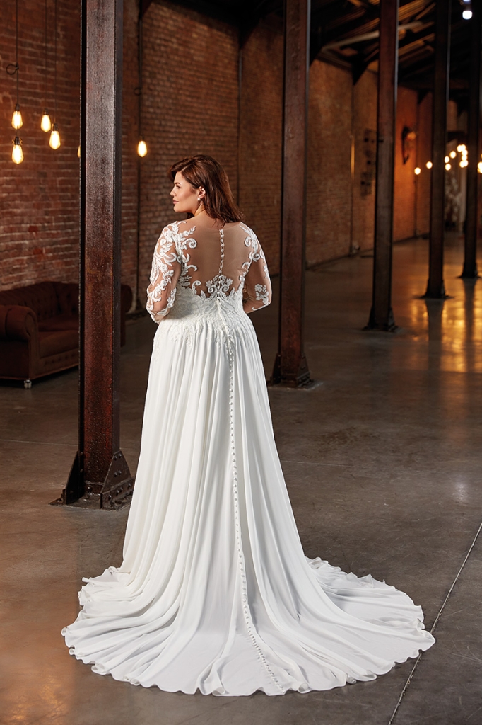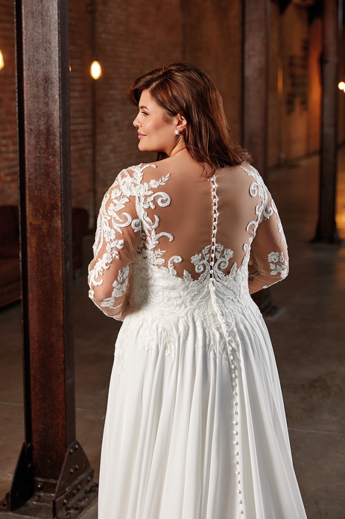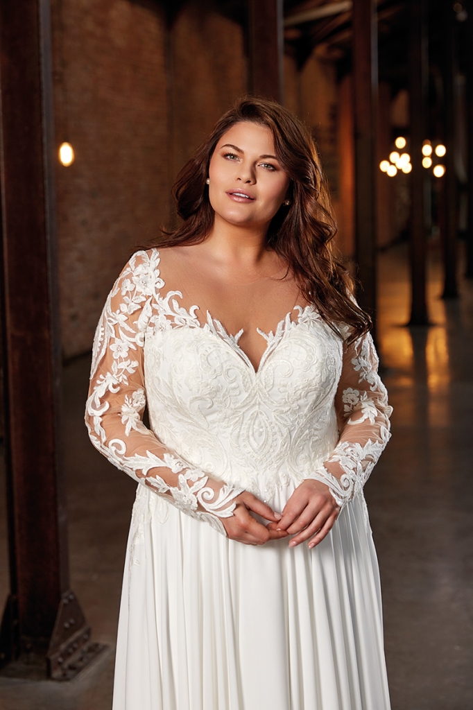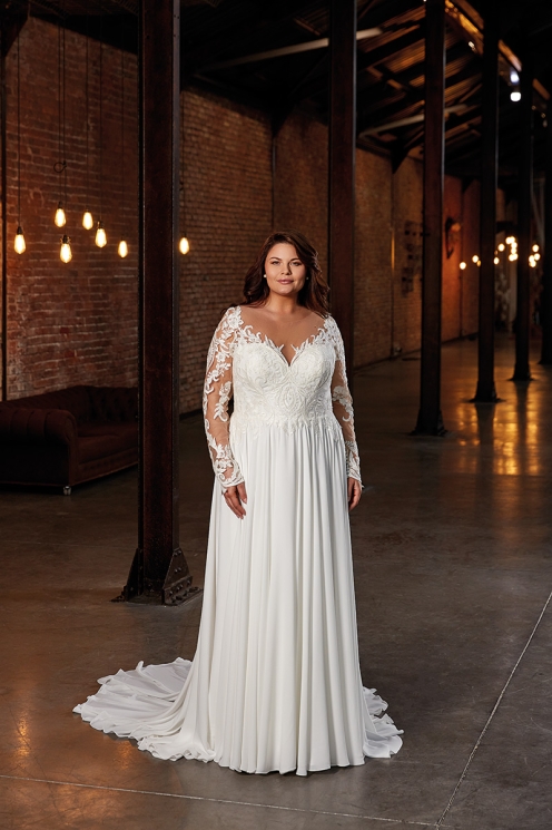 Modello scivolato in tessuto chiffon, corpetto in pizzo luminoso e manica lunga in pizzo effetto tattoo