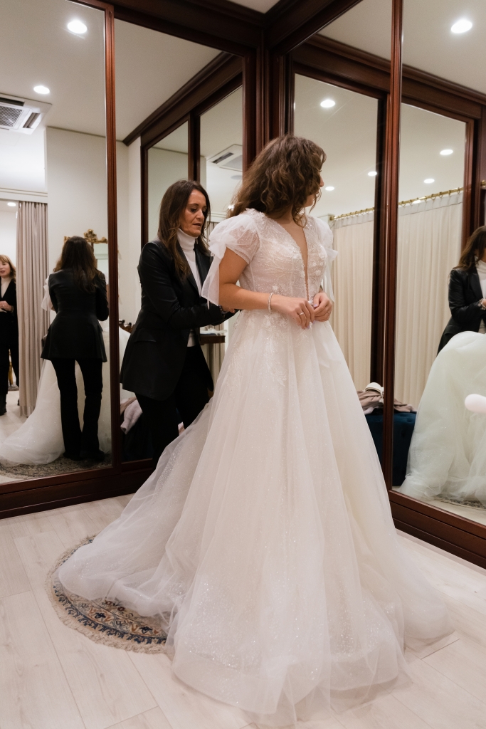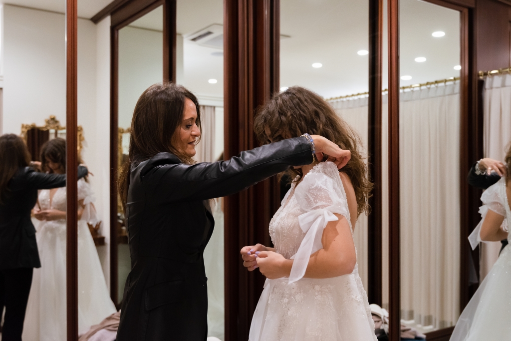 Avrai bisogno di una persona che possa aiutarti a indossare e chiudere l’abito, che sarà la stessa che verrà con te in Atelier e a cui faremo vedere tutti i passaggi.